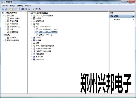 1、單擊計算機—單擊右鍵—管理—設備管理—端口。找到所用usb線端口。如下圖:
